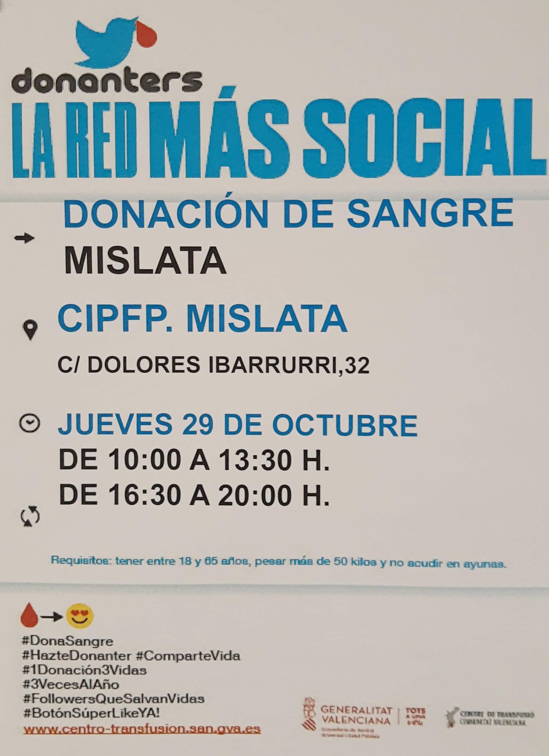 Leer másDonación de sangre en nuestro centro el jueves 29 de Octubre de 10:00 a 13:30 y de 16:30 a 20:00 ¡¡Te esperamos!! Gracias por tu colaboración