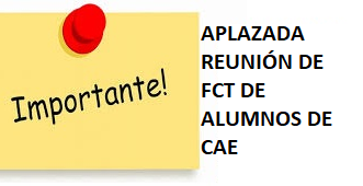 Leer másAVISO IMPORTANTE para los alumnos de 2º curso del CFGM de Auxiliar de Enfermería CAE Ante la previsión de lluvias del viernes 13 de septiembre, se ha decidido posponer la reunión de adjudicación de plazas para las FCT prevista para dicho día. Se cambia al martes 17 de septiembre a la misma hora y con…