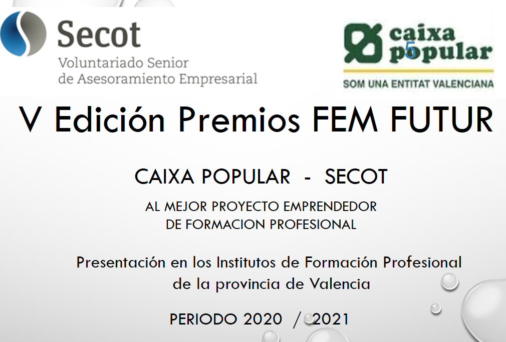 El proyecto de apoyo a jóvenes emprendedores, Fem-Futur FP, organiza un concurso al mejor proyecto emprendedor de Formación Profesional. Estos premios estan organizados por la asociación Secot (Seniors Españoles para la Cooperación Técnica) y Caixa Popular. Se concederán tres premios y un accésit, con las siguientes dotaciones: 1º. Premio dotado con 1.250 € y un…